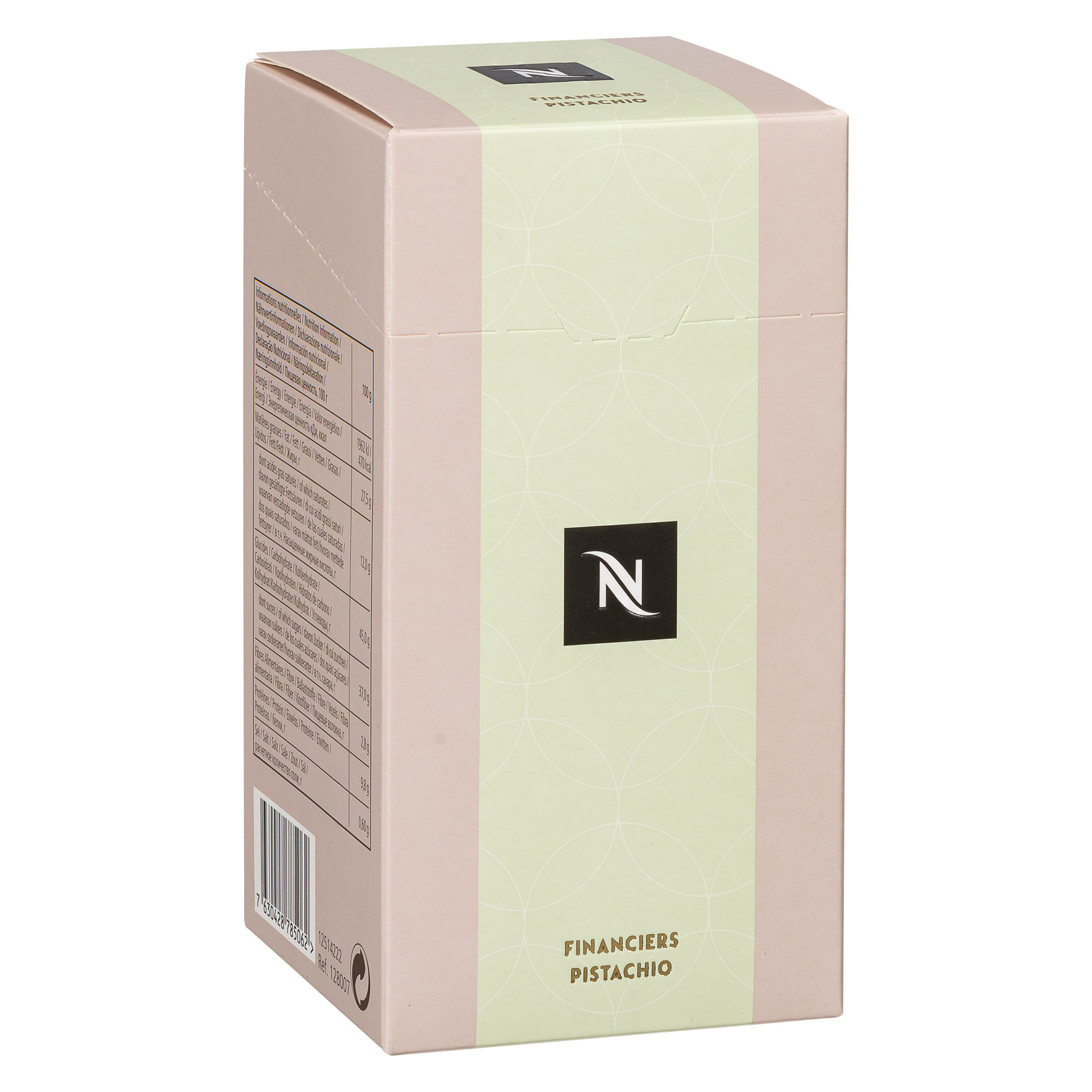 Description détailléePetits gâteaux aux amandes et pistache, recette exclusive Nespresso. - Emballés individuellement. Boîte de 120 g, 15 financiers.