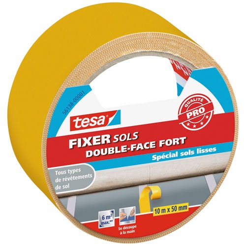 Description détailléeFixer sol double face adhésion forte 10 m x 50 mm de la marque TESA. Spécial sols lisses, tous types de revêtements, se découpe à la main.