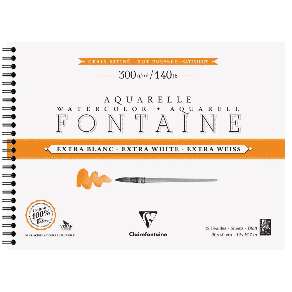 Papier aquarelle Fontaine 100% coton Extra Blanc, de qualité professionnelle. Sa composition, 100% pur coton premium et sa teinte extra blanche unique sur le marché, lui confèrent résistance, stabilité et luminosité des pigments. Son grain satiné, pressé à chaud et parfaitement lisse, est adapté aux aquarelles de précision et aux oeuvres détaillées. Son double-encollage végétal, au coeur et en surface, rend ce papier très agréable à travailler, en particulier dans l'humide et permet de préserver l'éclat et la brillance des pigments. Fabriqué dans la pure tradition des papiers d'art, ce papier est sans acide et vegan.
