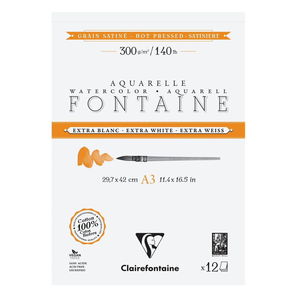 Papier aquarelle Fontaine 100% coton Extra Blanc, de qualité professionnelle. Sa composition, 100% pur coton premium et sa teinte extra blanche unique sur le marché, lui confèrent résistance, stabilité et luminosité des pigments. Son grain satiné, pressé à chaud et parfaitement lisse, est adapté aux aquarelles de précision et aux oeuvres détaillées. Son double-encollage végétal, au coeur et en surface, rend ce papier très agréable à travailler, en particulier dans l'humide et permet de préserver l'éclat et la brillance des pigments. Fabriqué dans la pure tradition des papiers d'art, ce papier est sans acide et vegan.