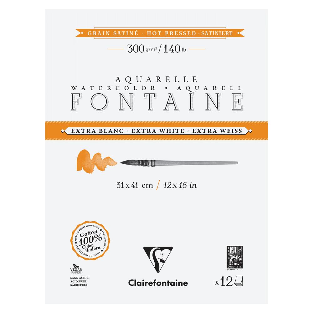 Papier aquarelle Fontaine 100% coton Extra Blanc, de qualité professionnelle. Sa composition, 100% pur coton premium et sa teinte extra blanche unique sur le marché, lui confèrent résistance, stabilité et luminosité des pigments. Son grain satiné, pressé à chaud et parfaitement lisse, est adapté aux aquarelles de précision et aux oeuvres détaillées. Son double-encollage végétal, au coeur et en surface, rend ce papier très agréable à travailler, en particulier dans l'humide et permet de préserver l'éclat et la brillance des pigments. Fabriqué dans la pure tradition des papiers d'art, ce papier est sans acide et vegan.