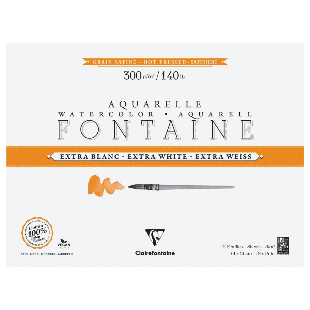 Papier aquarelle Fontaine 100% coton Extra Blanc, de qualité professionnelle. Sa composition, 100% pur coton premium et sa teinte extra blanche unique sur le marché, lui confèrent résistance, stabilité et luminosité des pigments. Son grain satiné, pressé à chaud et parfaitement lisse, est adapté aux aquarelles de précision et aux oeuvres détaillées. Son double-encollage végétal, au coeur et en surface, rend ce papier très agréable à travailler, en particulier dans l'humide et permet de préserver l'éclat et la brillance des pigments. Fabriqué dans la pure tradition des papiers d'art, ce papier est sans acide et vegan.