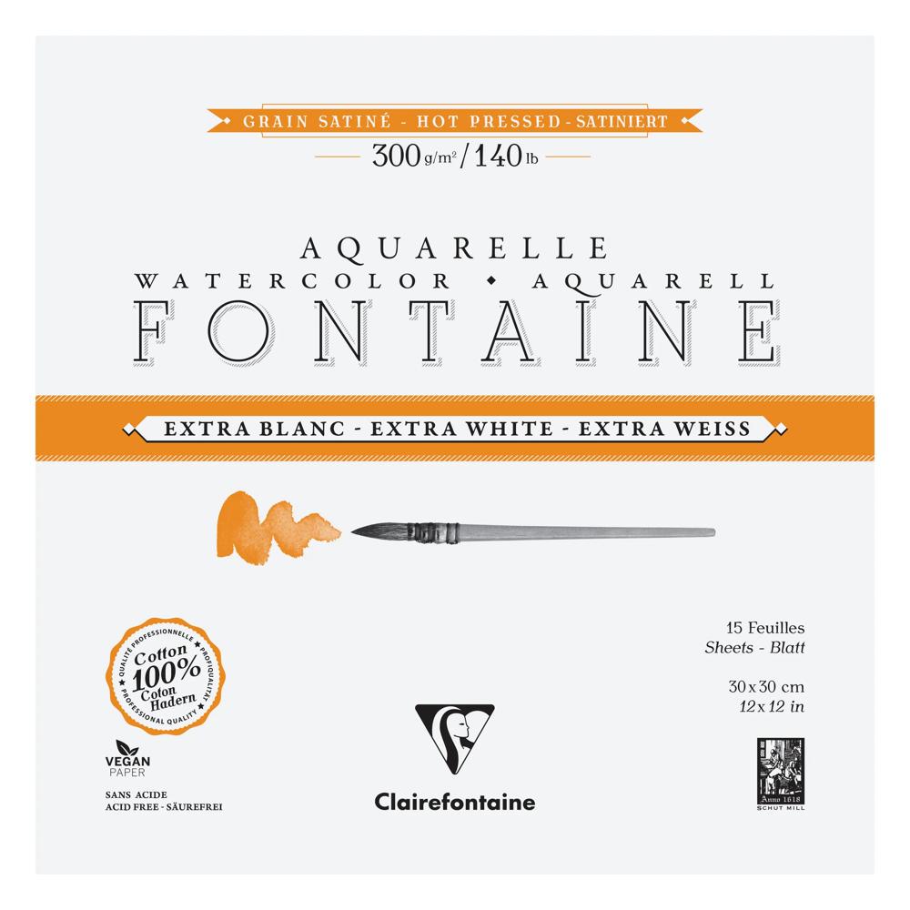 Papier aquarelle Fontaine 100% coton Extra Blanc, de qualité professionnelle. Sa composition, 100% pur coton premium et sa teinte extra blanche unique sur le marché, lui confèrent résistance, stabilité et luminosité des pigments. Son grain satiné, pressé à chaud et parfaitement lisse, est adapté aux aquarelles de précision et aux oeuvres détaillées. Son double-encollage végétal, au coeur et en surface, rend ce papier très agréable à travailler, en particulier dans l'humide et permet de préserver l'éclat et la brillance des pigments. Fabriqué dans la pure tradition des papiers d'art, ce papier est sans acide et vegan.