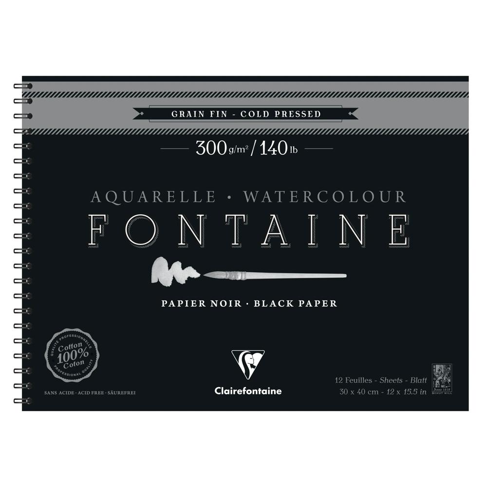 Papier aquarelle Fontaine 100% coton, de qualité professionnelle. Sa teinte noire profonde et son grain fin en font un support parfait pour donner une belle profondeur aux nuances claires, irisées et métallisées. Convient parfaitement à un mélange des techniques. Très résistant au grattage, excellence capacité d'absorption et repentir possible. Sans azurant optique, sans acide et de pH neutre.