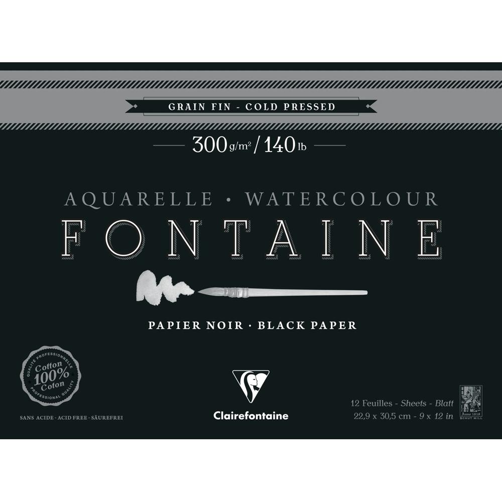 Papier aquarelle Fontaine 100% coton, de qualité professionnelle. Sa teinte noire profonde et son grain fin en font un support parfait pour donner une belle profondeur aux nuances claires, irisées et métallisées. Convient parfaitement à un mélange des techniques. Très résistant au grattage, excellence capacité d'absorption et repentir possible. Sans azurant optique, sans acide et de pH neutre.