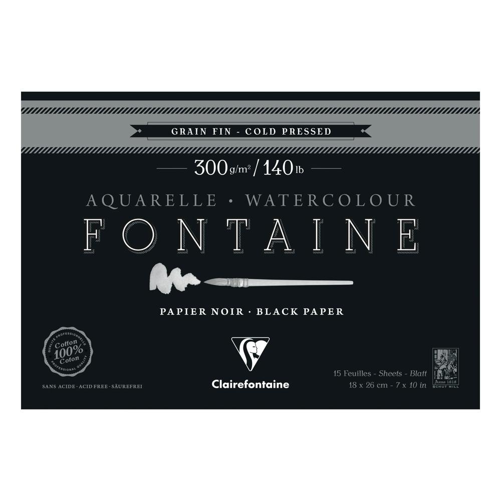 Papier aquarelle Fontaine 100% coton, de qualité professionnelle. Sa teinte noire profonde et son grain fin en font un support parfait pour donner une belle profondeur aux nuances claires, irisées et métallisées. Convient parfaitement à un mélange des techniques. Très résistant au grattage, excellence capacité d'absorption et repentir possible. Sans azurant optique, sans acide et de pH neutre.