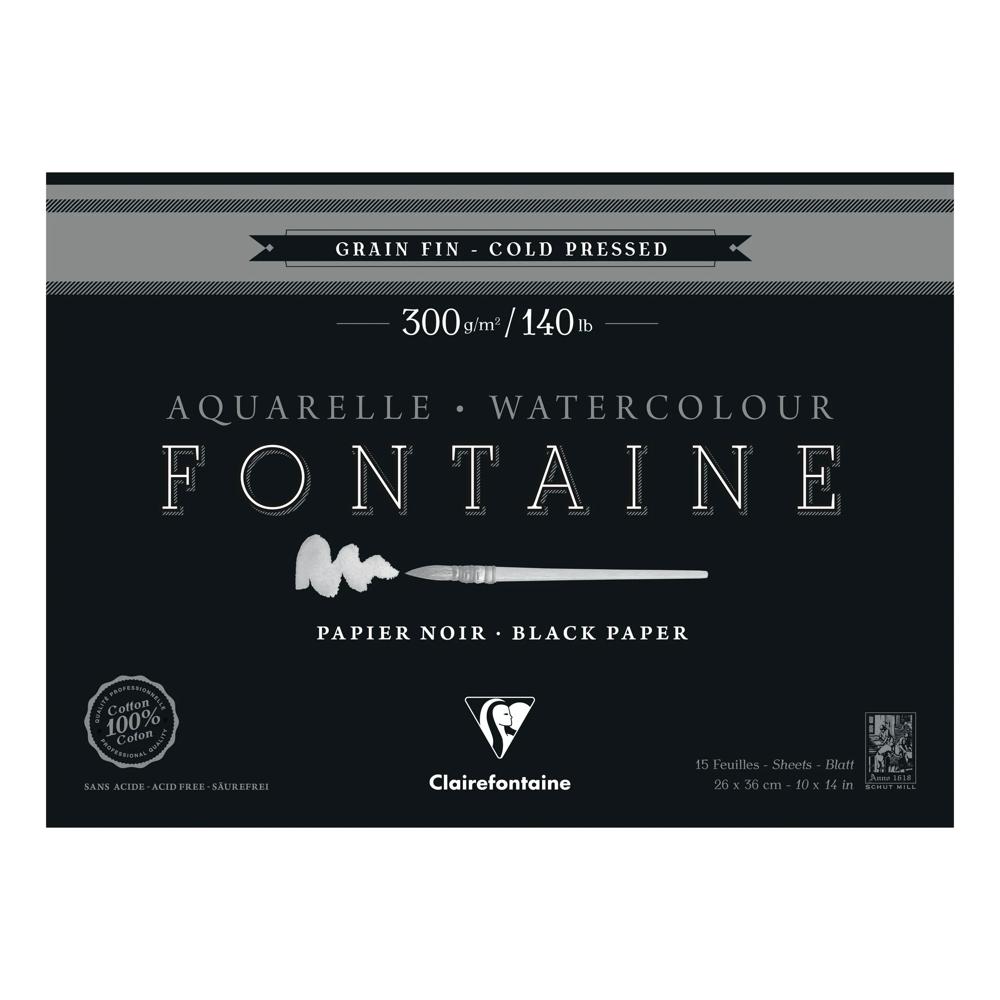 Papier aquarelle Fontaine 100% coton, de qualité professionnelle. Sa teinte noire profonde et son grain fin en font un support parfait pour donner une belle profondeur aux nuances claires, irisées et métallisées. Convient parfaitement à un mélange des techniques. Très résistant au grattage, excellence capacité d'absorption et repentir possible. Sans azurant optique, sans acide et de pH neutre.