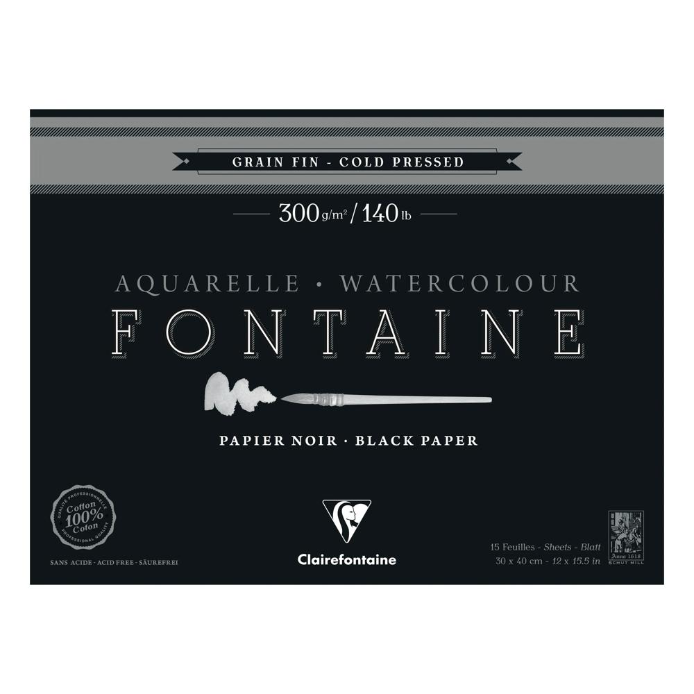 Papier aquarelle Fontaine 100% coton, de qualité professionnelle. Sa teinte noire profonde et son grain fin en font un support parfait pour donner une belle profondeur aux nuances claires, irisées et métallisées. Convient parfaitement à un mélange des techniques. Très résistant au grattage, excellence capacité d'absorption et repentir possible. Sans azurant optique, sans acide et de pH neutre.