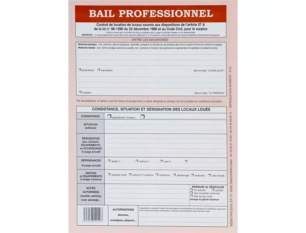 Le CONTRAT BAIL PROFESSIONNEL WEBER DIFFUSION 8 PAGES 1 ÉTAT LIEUX 1 CAUTION SOLIDAIRE (Référence : 810) est un ensemble de documents complets et bien structurés, conçus pour sécuriser et formaliser la mise en location de biens immobiliers à usage professionnel. Il inclut un contrat de bail de 8 pages, un état des lieux et une caution solidaire, offrant ainsi une solution pratique et sécurisée pour les bailleurs et les locataires.