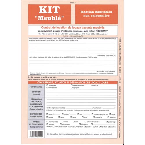 Le KIT CONTRAT LOCATION MEUBLÉE NON SAISONNIÈRE WEBER DIFFUSION 8 PAGES CONTRAT INVENTAIRE CAUTION ÉTAT LIEUX ENTRÉE SORTIE est une solution complète pour la gestion de la location meublée non saisonnière. Ce kit propose tous les documents nécessaires pour établir une relation locative claire et conforme aux réglementations en vigueur en France.