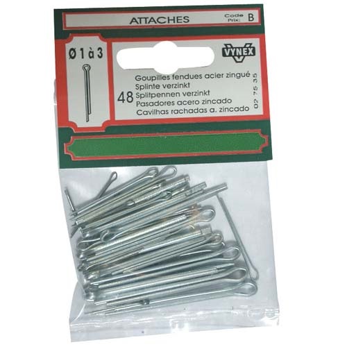 Les goupilles fendues de diamètre 1 à 3 mm en acier zingué lot de 48 de chez Vynex sont utilisées comme élément mécanique et verrouillage d'axe de manière temporaire. Résiste à l'effort latéral. Montage/ Démontage facile et rapide. Ne nécessite pas d'outils. On les appelle aussi goupille mécanique ou goupille à ressort fendue. Applications courantes : blocage d’écrous à chape, d’axes, ou de roues. Maintien d’éléments en rotation. Assemblages temporaires ou semi-permanents. Utilisée en mécanique, outillage, carrosserie, jardinage, modélisme.