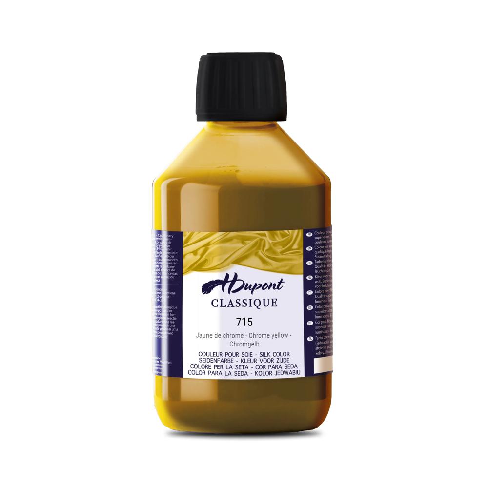 PEINTURE SUR SOIE : H Dupont est une marque de peinture sur soie. Composée de 85 couleurs brillantes et déclinée en 3 formats (125ml, 250ml, 1000ml). Les peintures sont miscibles entre elles pour permettre des possibilités de déclinaisons infinies. FIXATION VAPEUR : nécessite une fixation à l'étuve (procédé de fixation à la vapeur). La vapeur permet à la peinture de pénétrer à l'intérieur des fibres de la soie. Après fixation, la soie peut être lavée sans crainte de détérioration des couleurs. FIBRES ANIMALES : Les peintures H Dupont sont utilisées sur les fibres animales (soie, laine.). Les peintures sont lumineuses et d'une qualité supérieure. Principalement utilisées sur la soie, elles permettent de créer des réalisations uniques ! QUALITÉ SUPÉRIEURE : Couleurs à base de colorants acides. La forte concentration permet d'utiliser les couleurs pures ou diluées. Elles peuvent être utilisées en peinture ou teinture et ne laissent aucune porosité sur la soie après fixation. PREMIUM : H Dupont est une marque haut de gamme de peintures et auxiliaires pour soie. Utilisée par de nombreux professionnels de la soie. Découvrez l'entiereté de la gamme et initiez vous à la pratique créative et apaisante de la peinture sur soie.