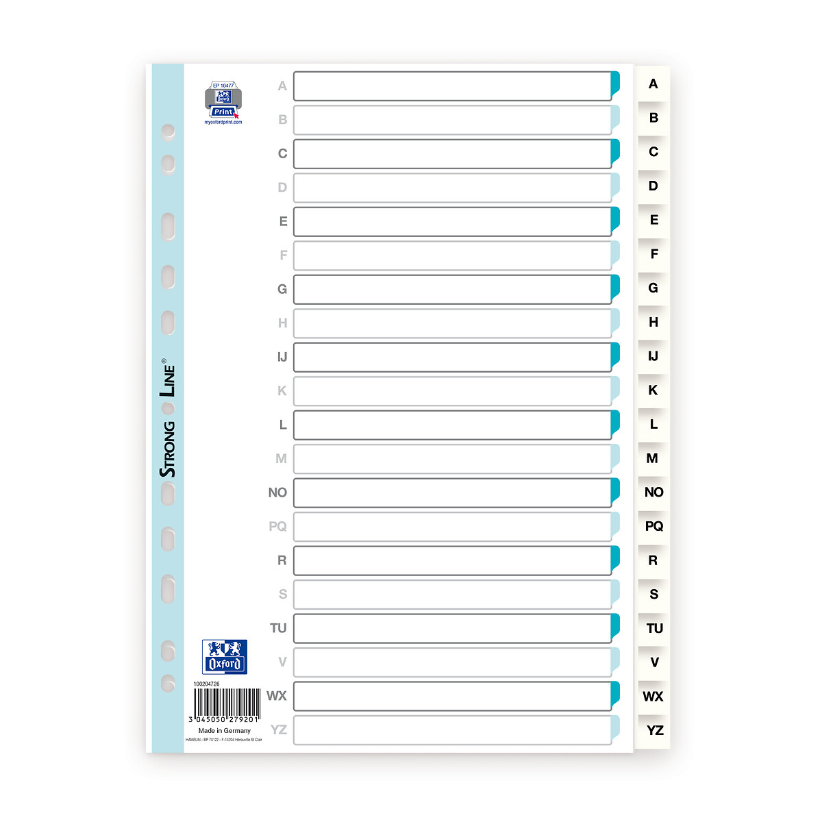 RESISTANCE : Les intercalaires sont en polypro opaque et souple. Le polypro assure des intercalaires robustes, qui résistent aux tâches, parfaits pour un usage quotidien. PAGE DE GARDE : Une page de garde blanche, personnalisable sur notre site, permet d'identifier le contenu des intercalaires. Elle est renforcée Strong Line, pour une meilleure résistance. ONGLETS : Les 20 onglets blancs permettent d'identifier rapidement et facilement le contenu des intercalaires. Ils sont imprimés avec une ou deux lettres de l'alphabet pour offrir un classement par ordre alphabétique.-PERFORATION : Les intercalaires sont perforés à 11 trous pour faciliter leur insertion dans un classeur. Ils s'adaptent à tout type de classeur car leur perforation est universelle. COMPATIBILITE : Les intercalaires au format A4 sont compatibles avec les feuilles simples et les copies doubles de même format. Elles ne dépassent pas des intercalaires et les onglets seront toujours visibles.-