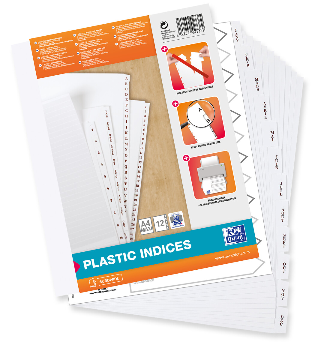 ONGLETS : Les 12 onglets blancs permettent d'identifier rapidement et facilement le contenu des intercalaires, et d'opter pour un classement sobre et élégant. PERFORATION : Les intercalaires sont perforés à 9 trous pour faciliter leur insertion dans un classeur de format A4 ou plus. COMPATIBILITE : Les intercalaires au format A4XL (22,5x30,2cm) sont compatibles avec les pochettes perforées de même format. Elles ne dépassent pas des intercalaires et les onglets seront toujours visibles. OPACITE : Les intercalaires sont fabriquées en PVC résistant et ultra opaque, véritablement indéchirable et pour un contenu confidentiel en toutes circonstances.