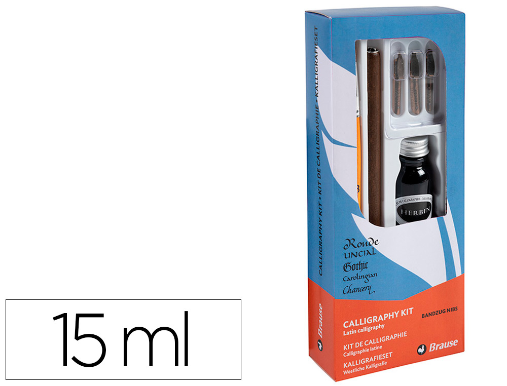 Ce kit complet d'apprentissage permet de réaliser toutes les calligraphies latines (Onciale/Caroline/Gothique/Chancelière/Ronde). Ce coffret contient 3 plumes de calligraphie Bandzug (1,5/2,5/3mm), 1 porte-plume en bois, 1 pinceau de taille 8 pour remplir les réservoirs des plumes Bandzug, 1 flacon d'encre de calligraphie Jacques Herbin de couleur noire (15ml) et 1 notice explicative. Fabrication française.