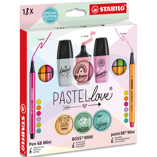 Description détailléeContenu: 6x feutre Pen 68 Mini, 6x feutre à pointe fine point 88 mini et 6x surligneur BOSS MINI assorti dans 6 couleurs pastel