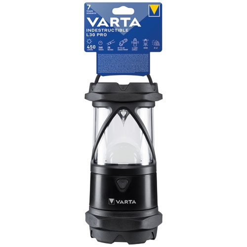 La lampe lanterne Indestructible L30 Pro 6 piles LR06 coloris noir de chez Varta a une conception robuste avec des éléments en caoutchouc, de l'aluminium anodisé, leur étanchéité à l'eau, à la poussière et leur résistance aux chocs, elles sont extrêmement solides et sont conçues pour durer et vous accompagner pendant très longtemps. Leur rendement lumineux est élevé même dans les situations les plus difficiles. L'essentiel à savoir : lanterne extrêmement robuste (test de chute de 4 mètres) avec éléments caoutchoutés absorbant les chocs, lentille et réflecteur résistant aux chocs, indice de résistance aux chocs IK08 (IEC 62262), imperméable à l'eau et à la poussière (IP67), technologie LED COB, 4 niveaux d'éclairage : élevé, moyen, faible, veilleuse de nuit, mode veilleuse à activer par double-clic, distribution de la lumière à 360°, tête amovible et un crochet intégré à la base permettent de suspendre la lanterne, poignée extra-large et pratique sur le dessus. Caractéristiques : poids avec piles 765.8 gr, longueur 215 millimètres, diamètre de la tête 98.3 millimètres, 450 lumens, autonomie de 360 heures, portée du faisceau 20 mètres. 4 modes d'éclairage, IP67, IK08, test de chute 4 mètres. Garantie 7 ans. Piles non incluses.