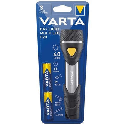 La lampe torche Day Light Multi LED F20 2 piles LR06 coloris noir/gris de chez Varta est un classique de la gamme pensée pour une utilisation fiable au quotidien. L'esseniel à savoir : LED haute performance. Le boîtier à trois composants résistant aux chocs (aluminium, caoutchouc, plastique ABS). Dragonne inclus, piles Varta Longlife Power incluses. Poids total de la torche 137.6 gr pour une longueur de 163.5 millimètres. Diamètre de la tête 45 millimètres. Puissance de 40 lumens, autonomie de 62 heures, portée du faisceau 29 mètres. Test de chute 1 mètre. Matériaux : Plastique ABS, aluminium, TPR, AS. Garantie 3 ans. Conçue pour un usage quotidien, les lampes de poche Day Light Multi LED de Varta sont équipées de LED très performantes et d'un boîtier à trois composants résistant aux chocs. Une lanière permet une manipulation aisée.