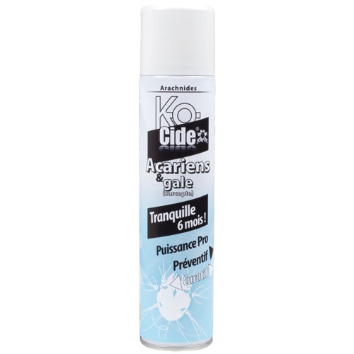 La laque anti-acariens et gale entretien en 300 mL de chez KO-cide à un effet longue durée tranquille 6 mois. C'est une laque pour un traitement préventif et curatif. Grâce à sa formulation concentrée et équilibrée, elle permet la destruction des acariens (micro-organismes provoquant des phénomènes allergiques chez les êtres humains) et sarcoptes (gale). Conçue pour le traitement de zones inaccessibles notamment matelas et sommiers ou de volumes réduits tels que couloirs, cages d’escaliers, tapis et canapés. Bien agiter l’aérosol avant utilisation. Usage intérieur. Passer l’aspirateur avant utilisation. Pulvérisez briévement dans les pièces ou sur les supports à traiter. Renouvelez l’application au printemps et à l’automne en insistant sur la literie. Nous vous conseillons vivement de réaliser deux fois par an un traitement de fond de vos chambres avec notre aérosol à pulvérisation automatique : K-OCIDE anti-acariens pulvérisateur automatique (Réf. KV) . Conseils, traiter l’intérieur du sac neuf de l’aspirateur avant de le mettre enT place (écraser la poche de manière à chasser le gaz avant la mise en place dans l’aspirateur). Peut-être utilisé en traitement des vêtements contaminés par la gale (placer les vêtements dans un sac et pulvériser sur chaque couche de vêtements et laisser agir 8 heures, sac refermé). Traitement préventif et curatif, foudroyant et persistant 6 mois environ selon les supports. Ne tache pas, inodore après application.