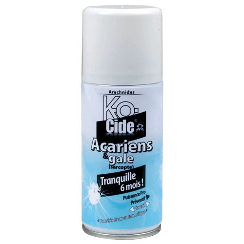La laque anti-acariens et gale en pulvérisateur automatique pour une superficie de 35 m² environ de chez KO-cide est un fogger. Il permet un effet choc et d’abattage immédiat des acariens source d’allergies chez les êtres humains) et des sarcoptes (gale). Cet aérosol à pulvérisation automatique permet de traiter une pièce d’environ 35 m2 (se vide en 110 secondes). Bien agiter l’aérosol avant utilisation. Usage intérieur. Fermer les issues, placer l’aérosol sur un tabouret au centre de la pièce, actionner le diffuseur et sortir pendant le traitement. Attendre 30 minutes avant de pénétrer à nouveau dans la pièce et la ventiler. Nous vous conseillons de traiter 2 fois par an. Egalement actif contre les sarcoptes (gales...) pour un traitement des pièces. Peut-être utilisé pour la destruction des poux en environnement. Ne pas repasser l’aspirateur avant 3 jours. C'est un traitement préventif et curatif. Le produit est foudroyant, persistant 6 mois environ selon les supports. Ne tache pas, inodore après application.