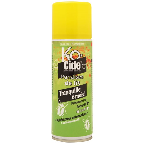 La Laque anti-punaises et punaise de lit en pulvérisateur automatique pour une superficie de 35 m² environ de chez KO-cide est un fogger spécial invasion. Grâce à sa formulation concentrée et équilibrée, adulticide, larvicide, ovicide, avec inhibiteur de croissance, il permet un effet “CHOC” et d’abattage immédiat ainsi qu’une protection persistante. Cet aérosol monodose permet de traiter un volume équivalant à une pièce d’ environ 35 m². Traitement préventif et curatif, foudroyant , persistant 6 mois environ selon les supports. Ne tache pas et est inodore après application. Bien agiter l’aérosol avant utilisation. Pour un usage intérieur. Procéder au nettoyage complet de la pièce et des surfaces à traiter avec un aspirateur. Fermez portes et fenêtres. Placer l’aérosol au centre de la pièce sur un tabouret légèrement en hauteur puis déclencher l’aérosol. Attendre deux heures avant d’aérer la pièce. Procéder au nettoyage complet de la pièce avec un aspirateur en insistant particulièrement sur les oreillers, coussins, moquettes, sommiers, matelas... La literie traitée ne doit pas être utilisée dans les 12 heures suivant l’application du produit.