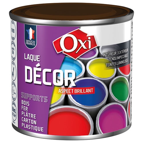 La laque décor aspect brillant de 60 mL en coloris chocolat de la marque OXI est multi-supports. Elle permet de décorer et retoucher tous les objets, meubles, bibelots et menuiseries. Elle s'applique en intérieur et en extérieur sur le fer, bois, plâtre, cartons, plastiques et elle offre un fort pouvoir couvrant ainsi qu'une excellente résistance aux chocs et aux rayures. Pour 8 à 10 m²/L. Peinture prête à l'emploi. A appliquer au pinceau en une ou deux couches en fonction du support. Séchage en 1h 30 et recouvrable en 6h. Nettoyage des outils à l'eau. Sans odeur. Certification Norme Jouet EN 71.3. Composition : à base de résines alkydes et acryliques.
