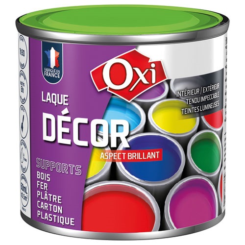 La laque décor aspect brillant de 60 mL en coloris vert pomme de la marque OXI est multi-supports. Elle permet de décorer et retoucher tous les objets, meubles, bibelots et menuiseries. Elle s'applique en intérieur et en extérieur sur le fer, bois, plâtre, cartons, plastiques et elle offre un fort pouvoir couvrant ainsi qu'une excellente résistance aux chocs et aux rayures. Pour 8 à 10 m²/L. Peinture prête à l'emploi. A appliquer au pinceau en une ou deux couches en fonction du support. Séchage en 1h 30 et recouvrable en 6h. Nettoyage des outils à l'eau. Sans odeur. Certification Norme Jouet EN 71.3. Composition : à base de résines alkydes et acryliques.