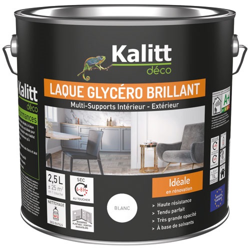La laque glycéro brillante multi-supports de 2.5 L en coloris blanc de la marque KALITT DÉCO convient aussi bien sur supports neufs qu'en rénovation en intérieur et extérieur. Elle s'applique dans toutes les pièces de la maison et directement sur d'anciennes peintures. La laque est haute résistance avec un tendu parfait. La laque étant à base de résine alkyde pour la réalisation de finitions résistantes, sa composition lui confère une excellente adhérence, un très bon pouvoir couvrant, de plus elle est lessivable. Pour le nettoyage des outils, il est recommandé d'utiliser du white spirit.