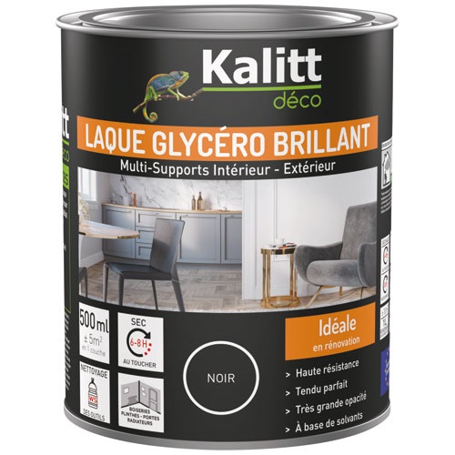 La laque glycéro brillante multi-supports de 500 mL en coloris noir de la marque KALITT DÉCO convient aussi bien sur supports neufs qu'en rénovation en intérieur et extérieur. Elle s'applique dans toutes les pièces de la maison et directement sur d'anciennes peintures. La laque est haute résistance avec un tendu parfait. La laque étant à base de résine alkyde pour la réalisation de finitions résistantes, sa composition lui confère une excellente adhérence, untrès bon pouvoir couvrant, de plus elle est lessivable. Pour le nettoyage des outils, il est recommandé d'utiliser du white spirit. La laque est à base de résine alkyde pour la réalisation de finitions résistantes.