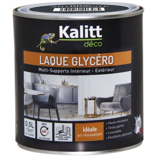 La laque glycéro brillante multi-supports de 500 mL en coloris gris de la marque KALITT DÉCO convient aussi bien sur supports neufs qu'en rénovation en intérieur et extérieur. Elle s'applique dans toutes les pièces de la maison et directement sur d'anciennes peintures. La laque est haute résistance avec un tendu parfait. La laque étant à base de résine alkyde pour la réalisation de finitions résistantes, sa composition lui confère une excellente adhérence, un très bon pouvoir couvrant, de plus, elle est lessivable. Pour le nettoyage des outils, il est recommandé d'utiliser du white spirit. La laque est à base de résine alkyde pour la réalisation de finitions résistantes.
