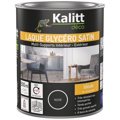 La laque glycéro satin multi-supports de 500 mL en coloris noir de la marque KALITT DÉCO convient aussi bien sur supports neufs qu'en rénovation en intérieur et extérieur. Elle s'applique dans toutes les pièces de la maison et directement sur d'anciennes peintures. La laque est haute résistance avec un tendu parfait. La laque étant à base de résine alkyde pour la réalisation de finitions résistantes, sa composition lui confère une excellente adhérence, un très bon pouvoir couvrant, de plus elle est lessivable. Pour le nettoyage des outils, il est recommandé d'utiliser du white spirit.