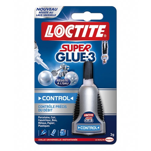 Colle instantanée super-puissante Super Glue 3 Liquide Control LOCTITE, son flacon permet de maîtriser très précisément le débit. Multi-matériaux, elle est fluide et s'étale facilement. Prise ultra rapide : quelques secondes suffisent. Embout auto-perceur. Système anti-séchage, elle est utilisable jusquà la dernière goutte. Quantité : tube de 3 g.. Coloris : transparent. Elle vous permet de coller : porcelaine, céramique, métaux, cuir, plastiques, caoutchouc, bois, papier, carton et tissu.