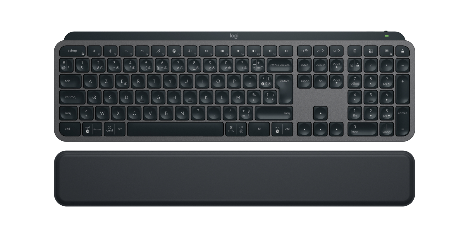 Logitech Master MX Keys S. Facteur de forme du clavier: Taille réelle (100 %). Style de clavier: Droit. Technologie de connectivité: Sans fil, Interface de l'appareil: Bluetooth, Interrupteur à clé de clavier: Commutateur de touche « ciseaux », Disposition des touches du clavier: AZERTY. Type de rétro: LED, Repose-poignets. Utilisation recommandée: Bureau. Couleur du produit: Graphite