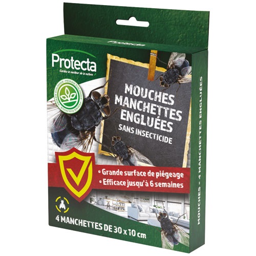 Manchettes tue-mouches MOUCH'CLAC pour lutter efficacement contre les mouches domestiques. Ce piège englué brillant avec des silhouettes de mouches servant de leurre se positionne à plat ou sous forme de cylindre. Dimension manchette : 10x30 cm. Lot de 4 manchettes. Ces manchettes MOUCH'CLAC peuvent se positionner n'importe où dans votre intérieur. Jusqu'à 6 semaines defficacité. Autorisé en agriculture biologique.