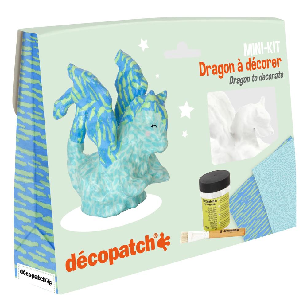 KIT COMPLET DECOPATCH : Une petite boite contenant tout le matériel pour s'amuser avec l'activité Décopatch ! Un joli petit animal à décorer qui vous fera craquer, 1 pinceau, 1 pot de colle et 2 feuilles de papier Décopatch pour personnaliser votre animal. ACTIVITE ENFANT : Le Mini-kit Décopatch est l'outil essentiel pour faire découvrir la technique Décopatch aux enfants tout en s'amusant. A la fin de la création, le petit dragon devient un objet de décoration, ou le jouet préféré de votre enfant ! Pour un anniversaire, pour Noël, voici une superbe idée cadeau à partir de 5 ans, fille ou garçon. UTILISATION : Pour réaliser le mini-kit, déchirez ou découpez quelques morceaux de papier Décopatch d'environ 2x2 cm. Appliquez ensuite la colle sur le support. Enfin déposez un morceau de papier sur la surface encollée et mettre une deuxième couche de colle par-dessus. DRAGON A DECORER : A l'aide des 2 feuilles fournis à l'intérieur, décorez et personnalisez votre dragon pour le rendre unique. DIMENSIONS : Figurine : 12x6,3x10,2 cm - 2 Feuilles de 30x40 cm. Conforme aux normes CE, fabriqué en France