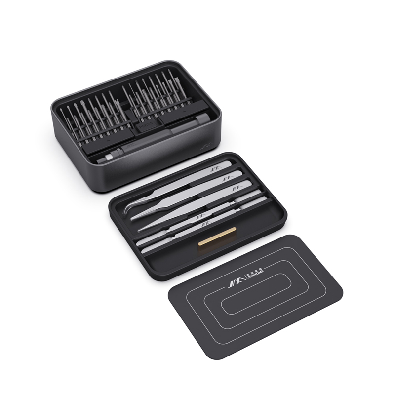 Le coffret de précision contient 32 embouts de vissage S2 avec 11 types d’empreintes, 3 brucelles, 2 mini pieds de biche en acier, un tournevis de précision, 1 magnétiseur/démagnétiseur et 1 tapis de travail magnétique. Le tapis magnétique est particulièrement utile pour garder les petites pièces en place, réduisant ainsi les risques de perte pendant vos travaux.