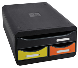 Le module Small-Box est polyvalent. Il permet à la fois de classer des documents, pochettes à élastiques au format A4+ mais également des petits accessoires, des stylos, des notes, ou des dosettes de café / sachets de thé / serviettes en papier.... Il trouve sa place au bureau, comme à la maison. Avec sa faible hauteur (13,5cm), ce module 3 tiroirs peut être utilisé comme réhausseur d'écran, tandis que sa large profondeur lui permet d'accueillir une machine à café. Le caisson est garanti 25 ans. Il est aussi superposable grâce aux 4 reliefs qui assurent la stabilité des caissons. Les façades des tiroirs sont ouvertes pour permettre de glisser les documents sans avoir à ouvrir les tiroirs. Les tiroirs sont agréables à utiliser, coulissants et silencieux équipés d'une butée d'arrêt de sécurité. Ils sont équipés de porte-étiquette pour identifier chaque compartiment. Le produit est garanti 25 ans