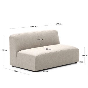 Module 2 places avec revêtement en tissu structuré non déhoussable. Pieds plastique noir, assise mousse polyuréthane, fibres acryliques et tissu 100% polyester. Usage intérieur, niveau 4 résistance aux UV. Densité de l’assise et du dossier 30 kg/m³. Outil de montage inclus pour réaliser les trous nécessaires. Dimensions H 78 cm x L 150 cm x P 89 cm. Poids max 300 kg.