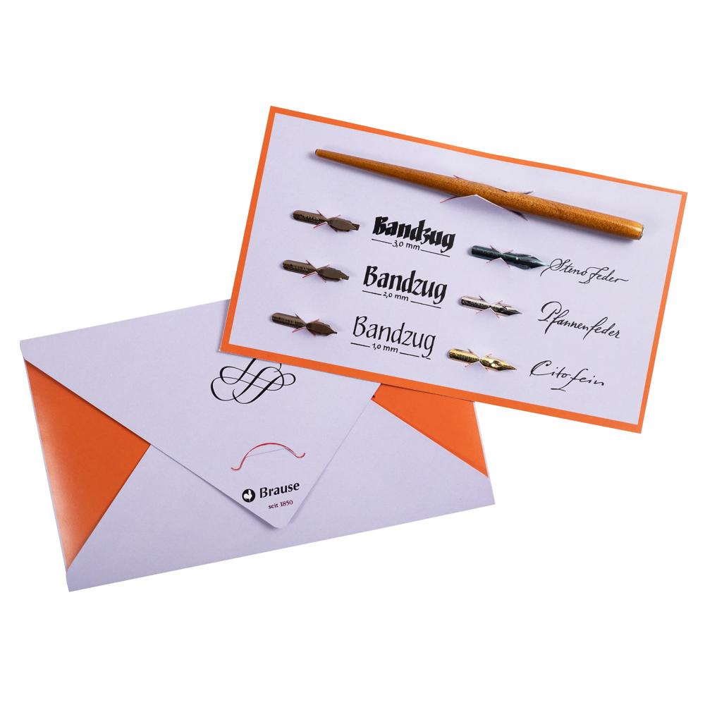 Ce set de calligraphie contient 1 porte-plume en bois, 6 plumes (Sténo/Pfannen/Cito Fein/3 Bandzug(1/2/3mm)) et une notice d'utilisa tion. Un petit set d'initiation à petit prix pour débuter ou se perfectionner en calligraphie ! Brause est le spécialiste depuis 1850 des plumes de calligraphie, de dessin et d'écriture. Fabrication allemande.