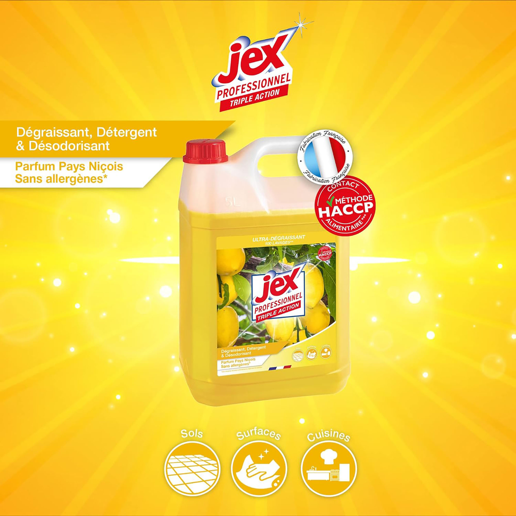 Complétez avec ces produitsDégraissant concentré à diluer Triple Action Jex Professionnel, Pays niçoisà partir de19,76 € HTSerpillère gaufrée superieure - paquet de 101 avisà partir de32,31 € HTChariot de lavage compact 2 seaux de 18L4 avisà partir de135,52 € HTFrange coton à languettes - Lot de 21 avisà partir de9,77 € HTBalai support pour frange - lavage à plat - L 40 cm3 avisà partir de29,98 € HTNettoyant désinfectant Jex Express pêche - Bidon de 5 litres1 avisà partir de17,36 € HT