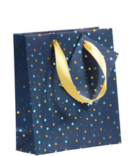 Description détailléePapier avec film PP, 170 g/m2, avec ruban satin doré, dimensions: (L)120 x (P)45 x (H)135 mm, mini