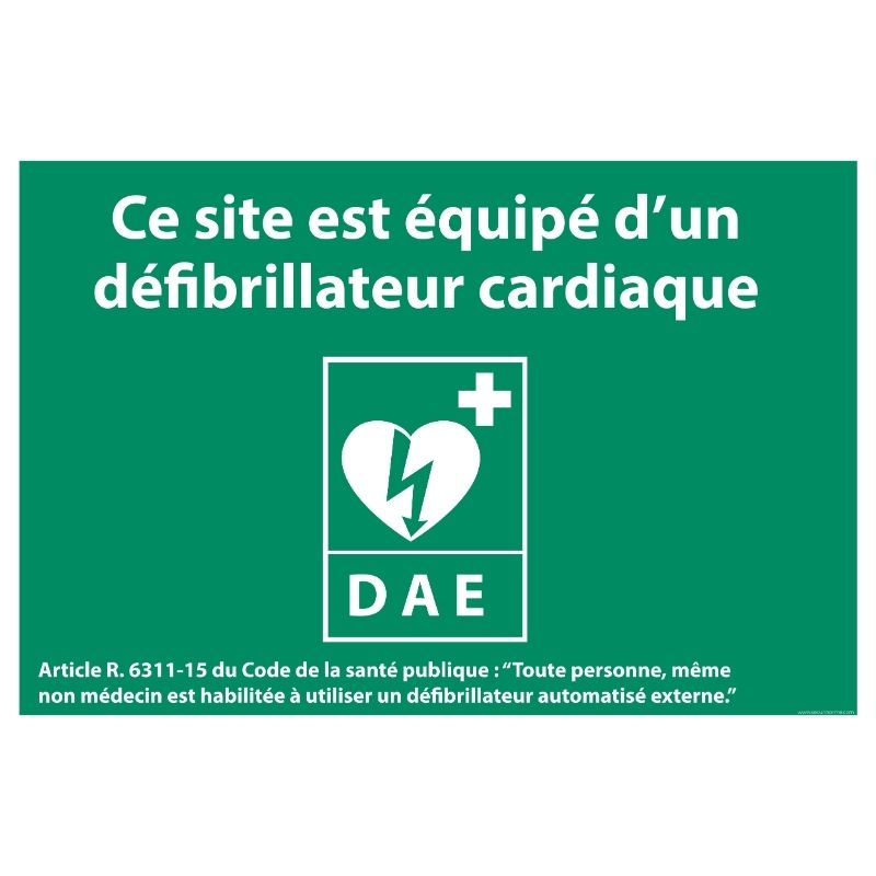 Assurez la sécurité de vos locaux avec notre panneau DAE "Ce site est équipé d'un défibrillateur cardiaque". Idéal pour signaler la présence d’un défibrillateur automatisé externe (DAE), ce panneau est conforme aux normes ISO EN 7010 et à l'arrêté du 29 octobre 2019, pour une identification efficace en cas d'urgence.