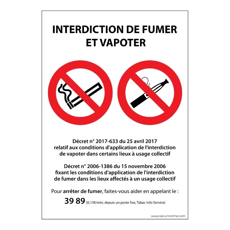 Panneau "Interdiction de Fumer et de Vapoter" avec Décret
