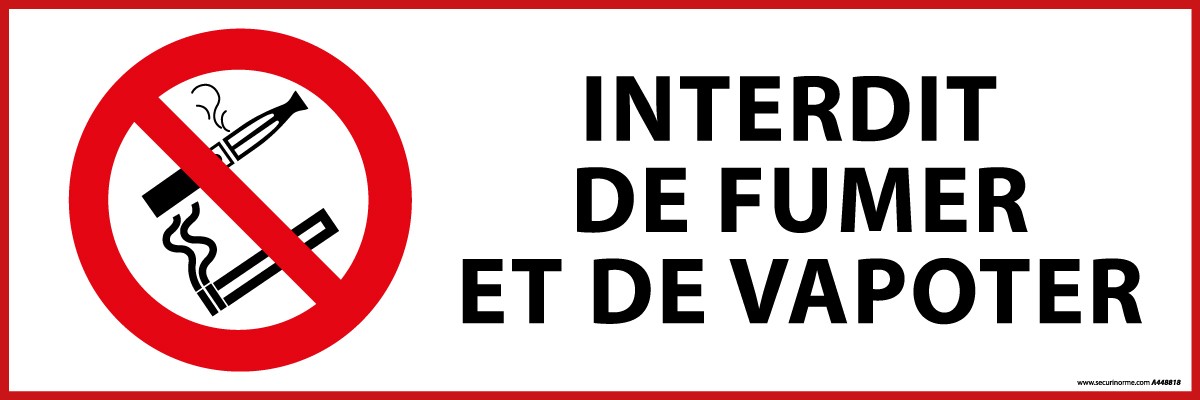 Panneau d'Interdiction "Interdiction de fumer et vapoter"Disponible en vinyle souple, pour une utilisation en intérieur, et en PVC, pour une utilisation en intérieur et en extérieur. Le modèle en vinyle est auto-adhésif tandis que le modèle en PVC est à fixer avec du double-face ou par perçage et vissage.Notre pictogramme Interdiction de fumer et de vapoter permet d'indiquer où il est interdit de fumer et de vapoter par mesure d'hygiène et de sécurité. Depuis le 1er Octobre 2017, il est en effet interdit de vapoter dans les locaux recevant des postes de travail situés ou non dans les bâtiments de l'établissement, fermés et couverts, et affectés à un usage collectif. Les lieux à usage collectif, comme les cafés, les hôtels ou les restaurants, ne sont pas concernés par l'interdiction de vapoter, sauf si le règlement intérieur le stipule.Plusieurs dimensions sont proposées pour satisfaire vos besoins en terme de signalétique. La dimension à choisir dépendra alors de votre espace, de la distance de lecture et de la hauteur du pictogramme. CaractéristiquesMatière : Vinyle SouplePVC LaminéFixation :Vinyle : Auto-adhésifPVC : Vissage ou double-faceFormat : RectangulaireOrientation : HorizontaleColoris : Rouge sur fond BlancPictogramme : Interdiction de fumer et de vapoterColoris Pictogramme : NoirDimensions :297 x 105 mm450 x 150 mmUtilisation :Vinyle : IntérieurPVC : Intérieur et ExtérieurSanctions contre le responsable des lieuxLe responsable des lieux (le cafetier par exemple) est passible d'une amende pouvant aller jusqu'à 750 ¤, s'il est dans l'un des cas suivants :- Il ne met pas la signalisation prévue rappelant le principe de l'interdiction de fumer ou de vapoter- Il met à la disposition des fumeurs un emplacement réservé non conforme aux normes techniques imposées- Il favorise volontairement, par quelque moyen que ce soit, la violation de l'interdiction de fumer