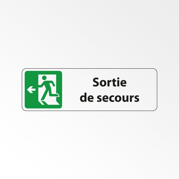 Le panneau comprend un pictogramme contrasté représentant une silhouette se dirigeant vers la gauche, accompagné du texte "Sortie de secours" en noir. Cette présentation simplifiée garantit que le message est bien compris, même par ceux qui ne maîtrisent pas la langue française.
