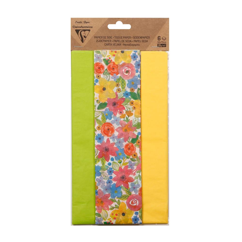 Essentiellement utilisé pour l'emballage, le papier de soie convient également aux activités créatives. D'une grande finesse et délicatesse, il apporte douceur, élégance, fluidité et offre de jolis effets de transparence Cet assortiment contient 2 feuilles motifs fleurs, 2 feuille jaune citron, 2 feuilles vert pomme.