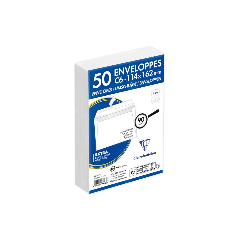 FORMAT : C6-114x162mm. Il peut contenir une feuille A4 (210x297 mm) pliée en 4. CARACTERISTIQUES : enveloppe sans fenêtre. Son fond est imprimé en gris, pour assurer la confidentialité de vos courriers. FERMETURE : Auto-adhésive, la colle est protégée par une bande siliconée, elle garantit une fermeture efficace et durable. CONDITIONNEMENT : Mise sous film par 50 enveloppes. PAPIER CLAIREFONTAINE 90g/m2 : Un touché supérieur et la garantie d'une grande blancheur. Certifié FSC pour garantir une gestion durable des forêts. Fabriqué en France dans notre usine au coeur des Vosges.