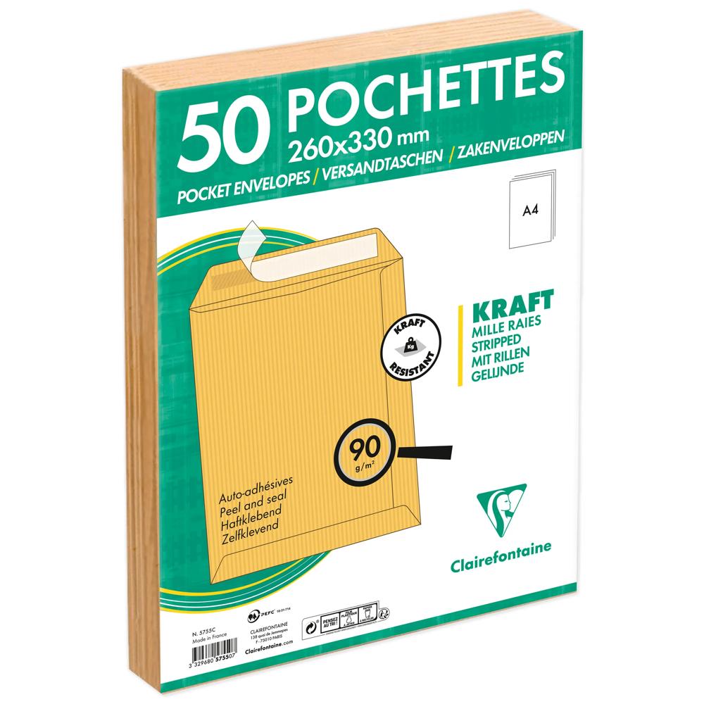 FORMAT : 24-260x330mm. Il peut contenir une feuille A4 (21x29,7cm) non pliée. CARACTERISTIQUES : pochette sans fenêtre. FERMETURE : Auto-adhésive, la colle est protégée par une bande siliconée, elle garantit une fermeture efficace et durable. CONDITIONNEMENT : Mise sous film par 50 pochettes. PAPIER KRAFT Milleraies 90g/m2 : Composé de fibres vierges il offre une grande résistance à la déchirure. Certifié PEFC pour garantir une gestion durable des forêts.Fabriqué en France dans notre usine au coeur des Vosges.