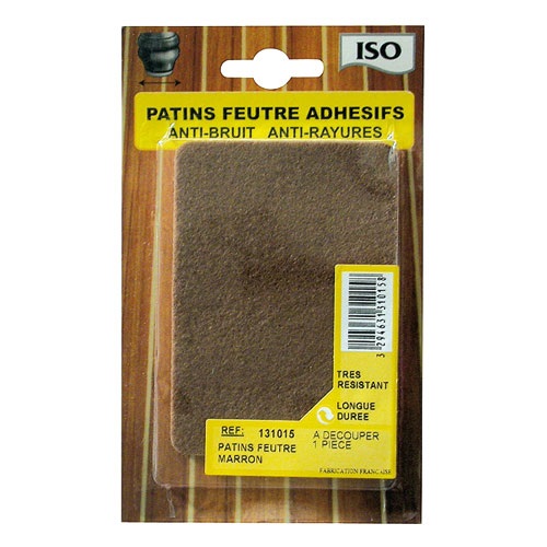 Le patin adhésif - feutre -marron - 75 x 100 mm de la marque ISO protège les sols et évitent le bruit et les rayures de vos chaises et feutaeuils. Pour les bibelots, vases, cendriers, ils évitent les vibrations. Très résistant grâce à sa composition et doté d'une très faible épaisseur.