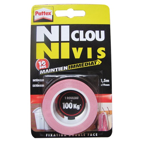 Ruban adhésif Ni Clou Ni Vis PATTEX. Fixation double-face. Un rouleau supporte l'équivalent de 120 Kg. Longueur : 1.5 m. Pour l'intérieur et l'extérieur. Sans solvant.